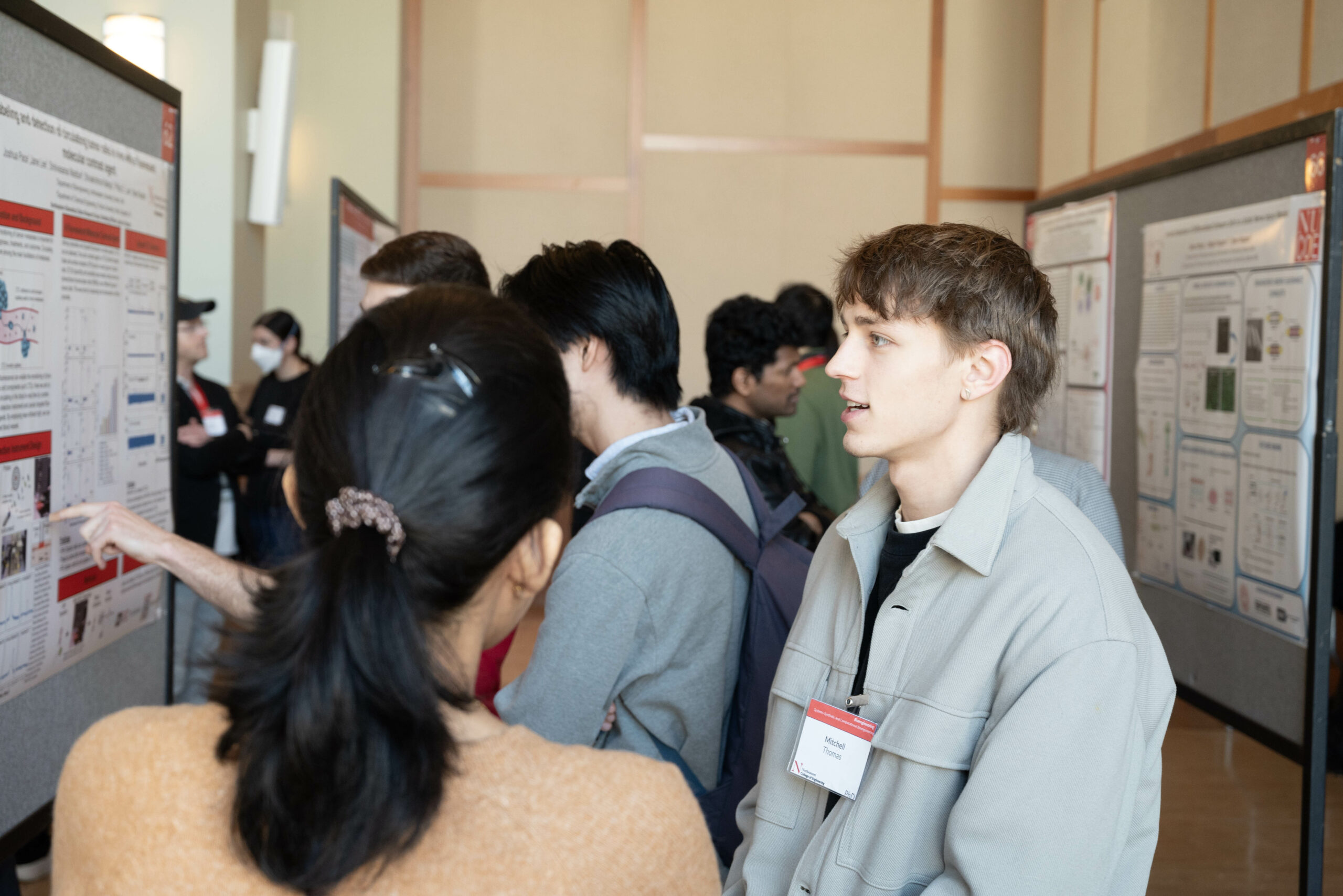 - Krishna Sarvani Desabhotla explains the details of her research project to another student.
