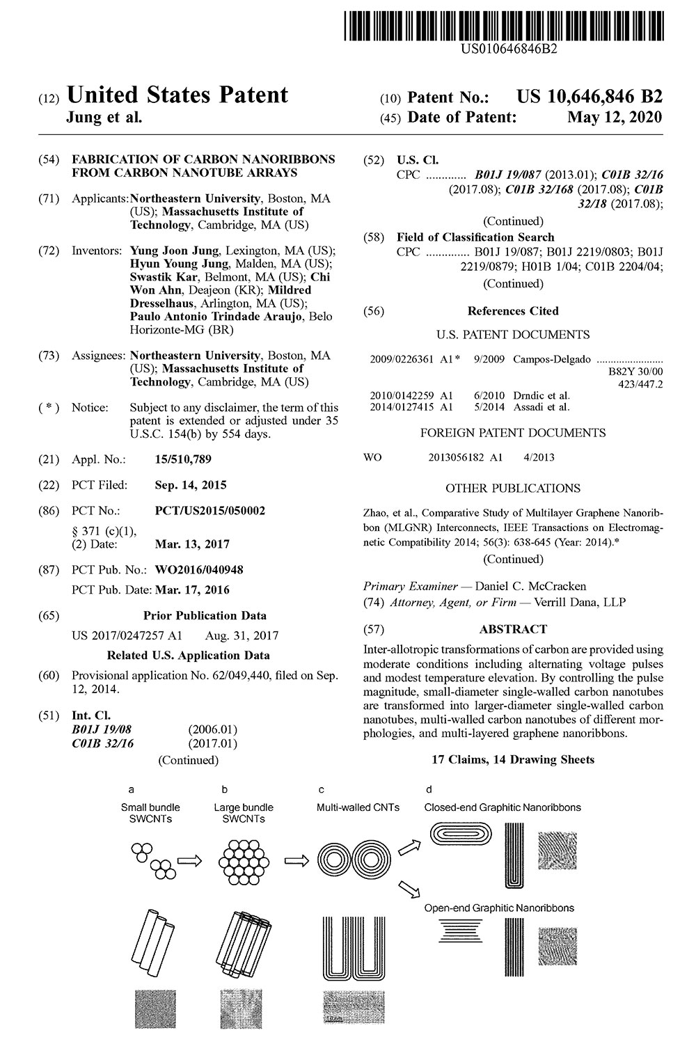 MIE Professor Yung Joon Jung and affiliated Physics Associate Professor Swastik Kar were awarded a patent for “Fabrication of carbon nanoribbons from carbon nanotube arrays.”