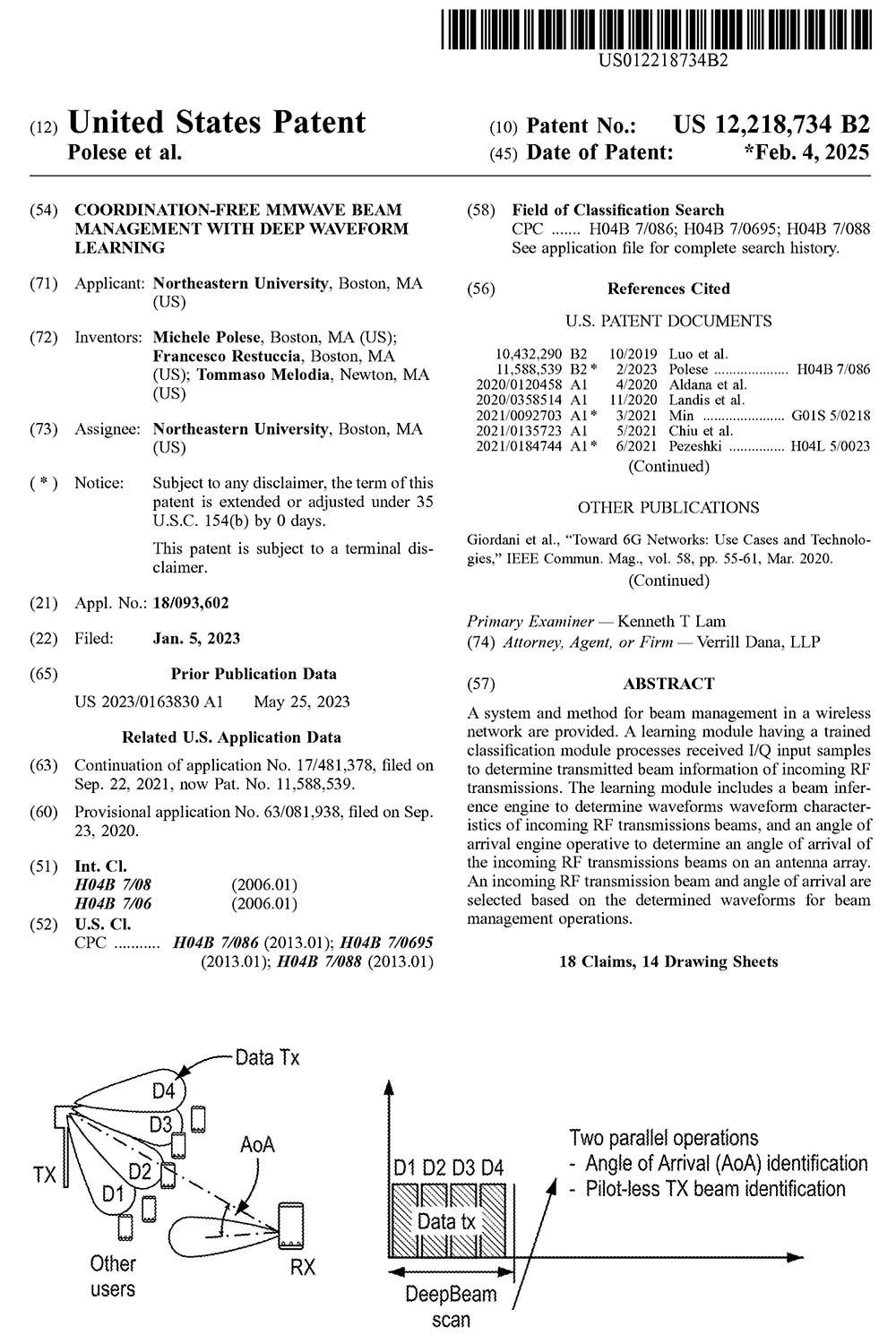 ECE Assistant Research Professor Michele Polese, Assistant Professor Francesco Restuccia, and William Lincoln Smith Professor Tommaso Melodia were awarded a patent for “Coordination-free mmWave beam management with deep waveform learning.”