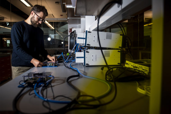 Main picture: Tommaso Melodia, William Lincoln Smith Chair Professor in the Department of Electrical and Computer Engineering, conducts research on a 3D-printed phantom of the human kidney in the Interdisciplinary Science and Engineering Complex. Photo by Ruby Wallau/Northeastern University
