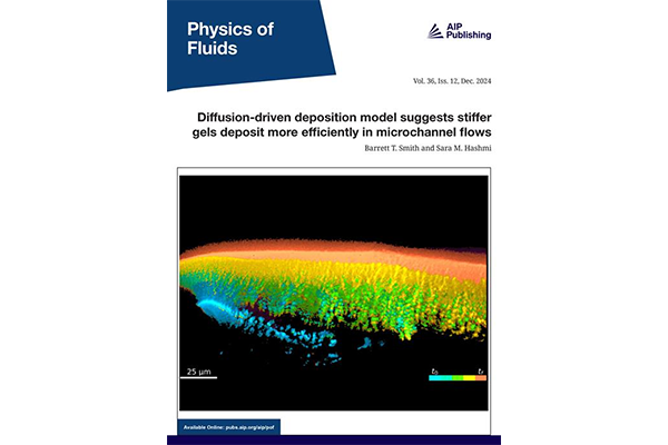 The research paper co-authored by Barrett Smith, PhD’24, chemical engineering, and ChE Assistant Professor Sara Hashmi on “Diffusion-Driven Deposition Model Suggests Stiffer Gels Deposit More Efficiently in Microchannel Flows” was featured on the cover of Physics of Fluids.